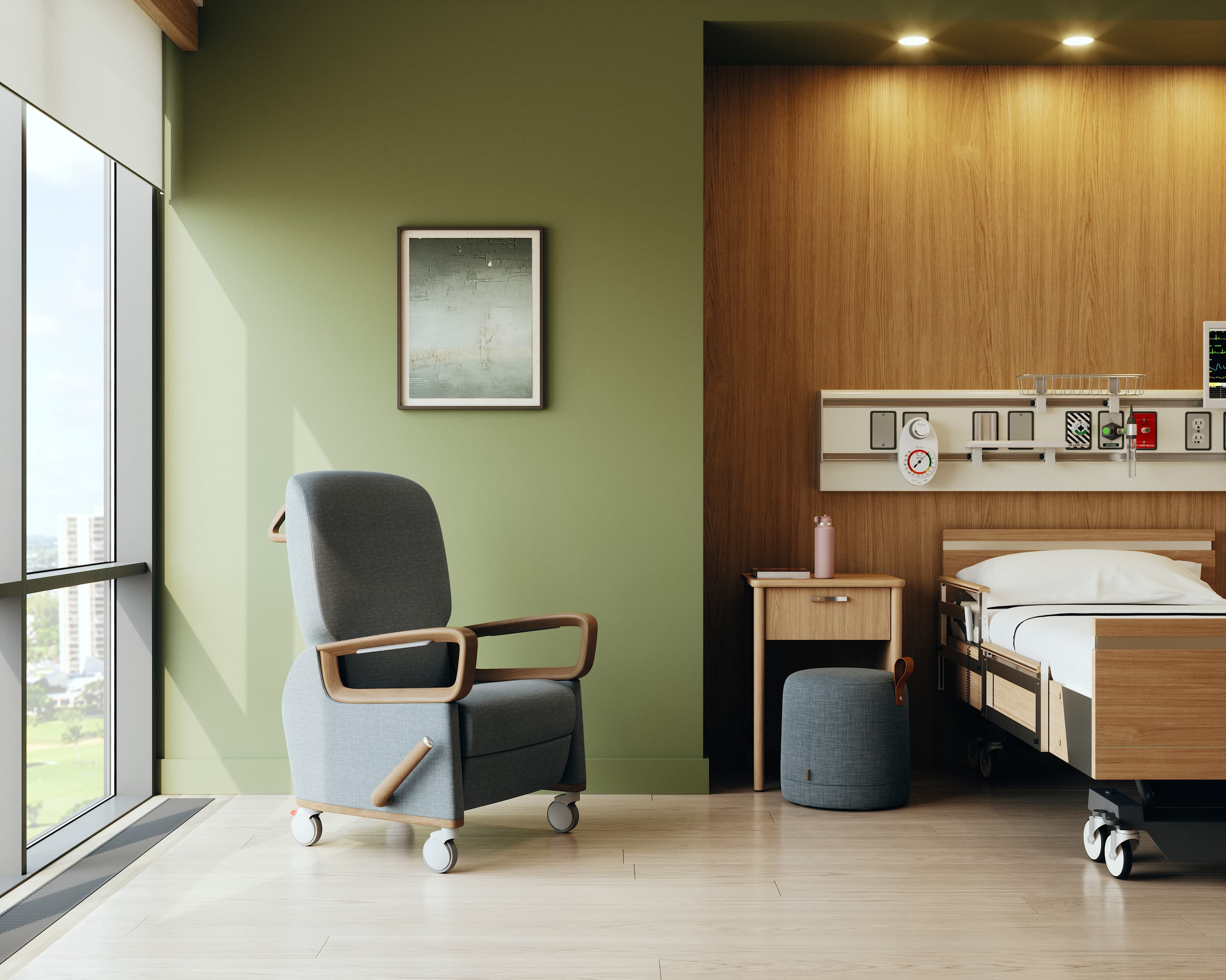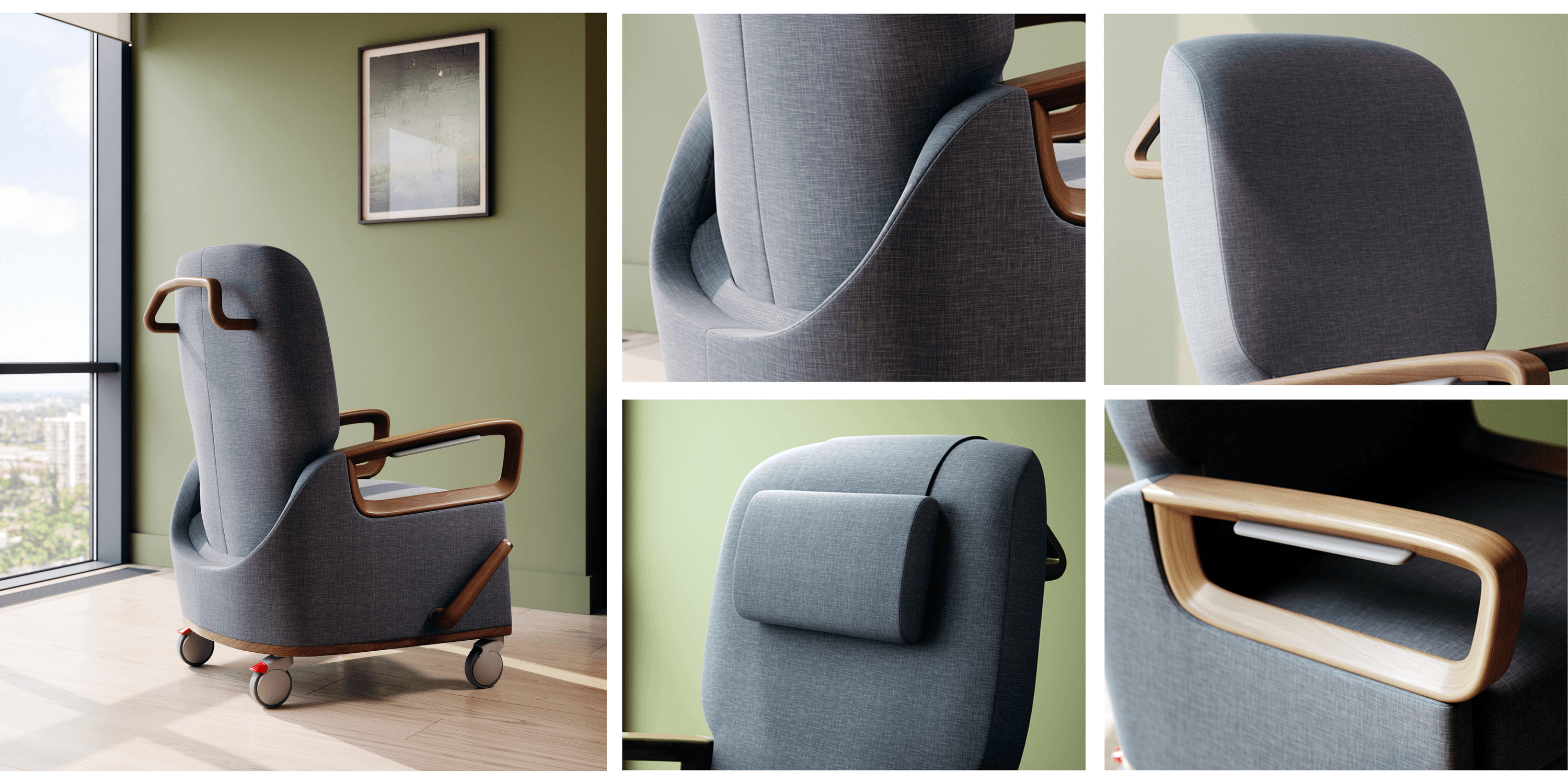 Ellie, a patient recliner Play Orbit designed for Kwalu, incorporates a range of user-centered, universal design features. But, one of the hardest-working features is its formal language. Drawing on research from neuroscience, biophilia, and Sensethetics, we broke away from the boxy, constructed forms typical of healthcare recliners. Instead, we created curving contours—fluid lines that evoke a sense of natural flow and erosion, that soften forms and embrace the user. It’s a language designed to 1) reduce stress for individuals who, at their most vulnerable, are in an environment that includes harsh reflective surfaces, flashing lights, shiny metals, dripping tubes, and that bed (!); and 2) convey understanding, embrace, and a familial sense of dependency and belonging to encourage the early mobility of the other soft natural form in this clinical context, the user.