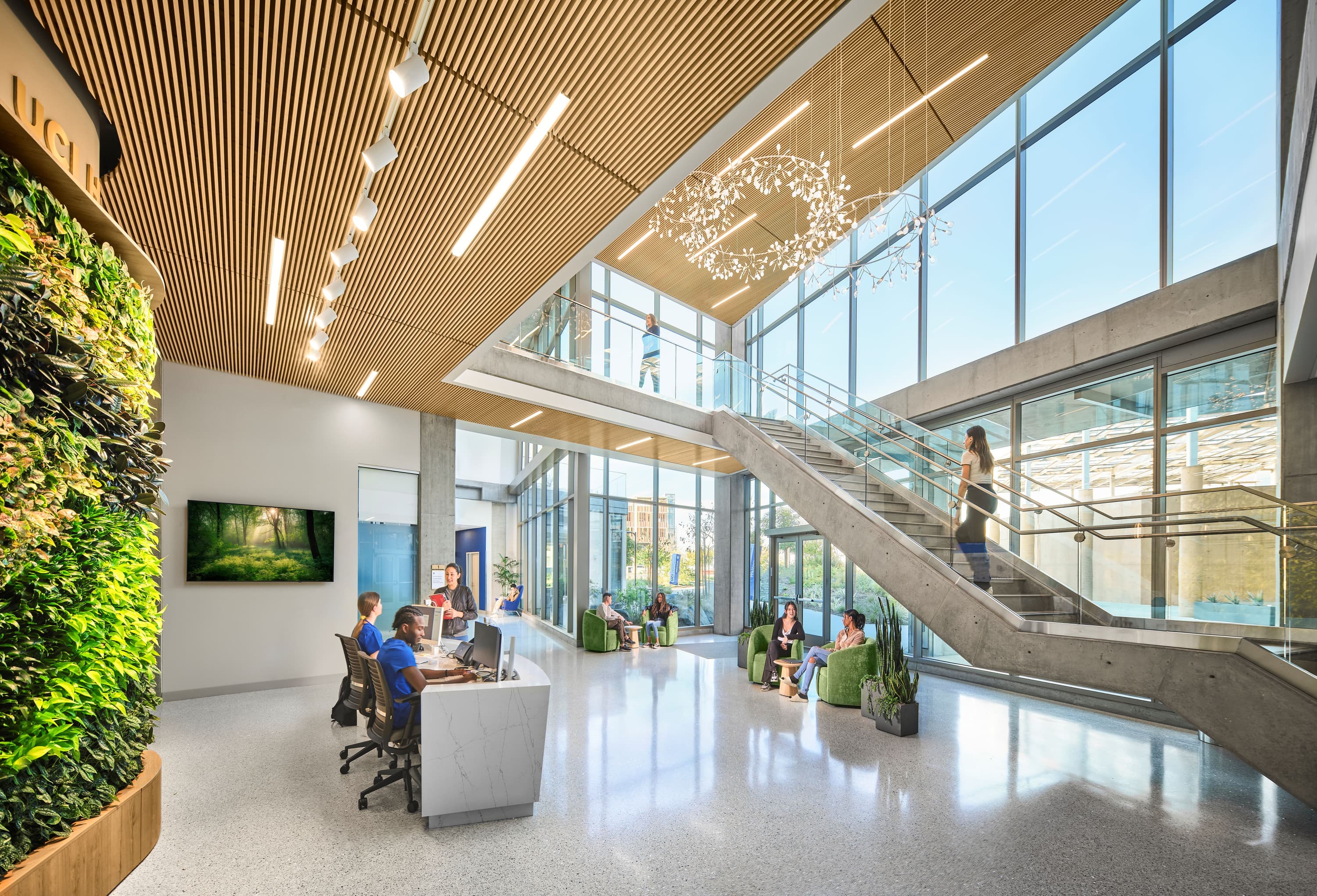 Sustainability is integral to wellness, as it encompasses not only environmental health but also social and economic well-being. Designing medical education buildings with sustainable principles reduces environmental impact, improves indoor air quality, and creates healthier spaces for occupants. Incorporating energy-efficient systems, sustainable materials, and passive design strategies reduces resource consumption and enhances the overall quality of the indoor environment. Furthermore, promoting sustainable practices instills a sense of responsibility and stewardship among students, preparing them to address environmental challenges in their future careers. At the Susan & Henry Samueli College of Health Sciences and Sue and Bill Gross Nursing and Health Sciences Hall at the University of California, Irvine, sustainability was a key driver in the design of this building. Visitors are welcomed into a bright, vibrant lobby that envelopes them with natural wood finishes and a two-story living wall. The living wall produces oxygen and is sustained by built-in self-irrigation systems.