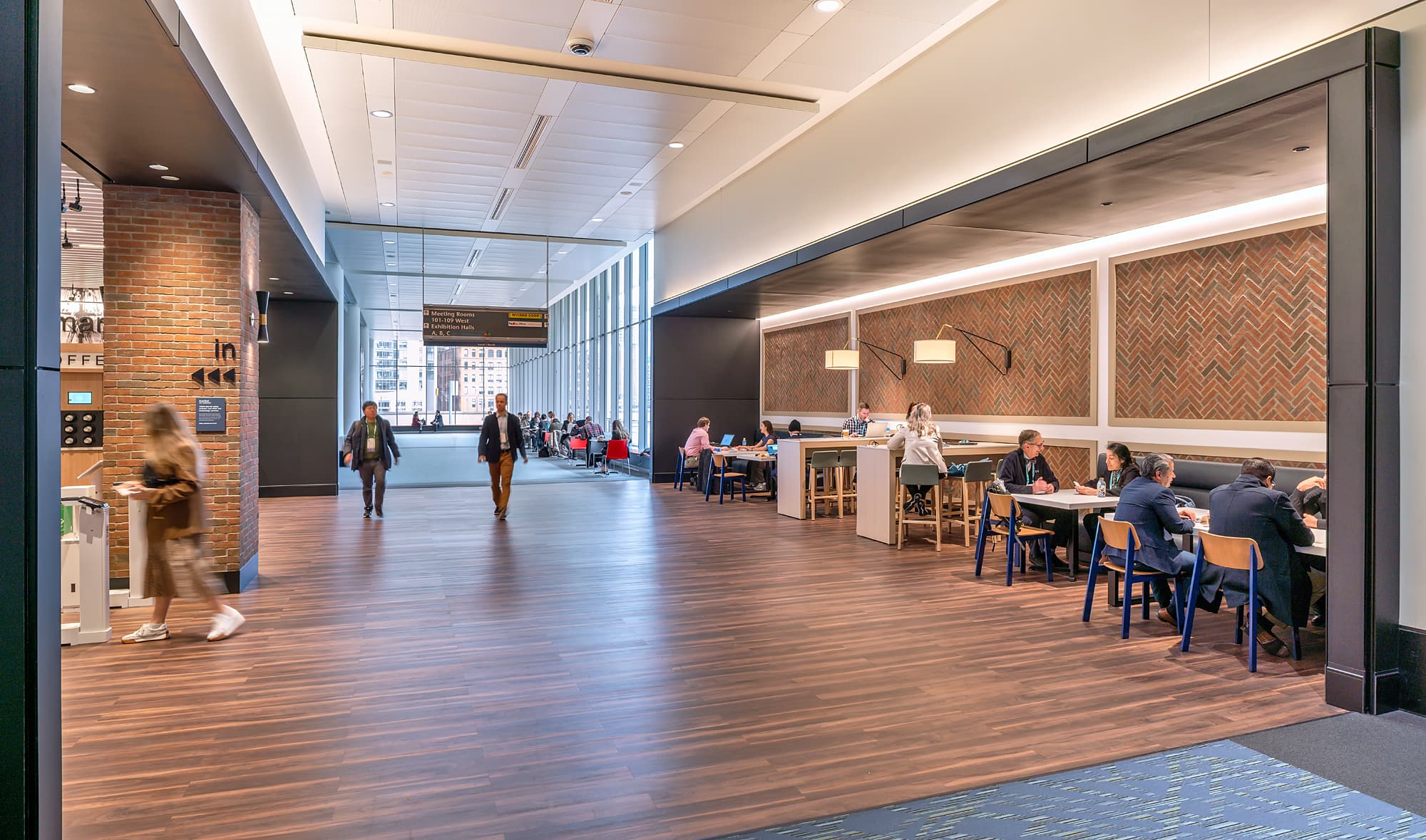 Just down the corridor, we reimagined an abandoned FedEx store into a new frictionless market. Utilizing Amazon-Go technology, the market offers attendees a seamless way to grab a quick bite or cup of coffee. Adjacent to the market, a restaurant-inspired seating area, set against the backdrop of classic Boston brick, provides a warm, inviting space to relax, recharge, or connect.