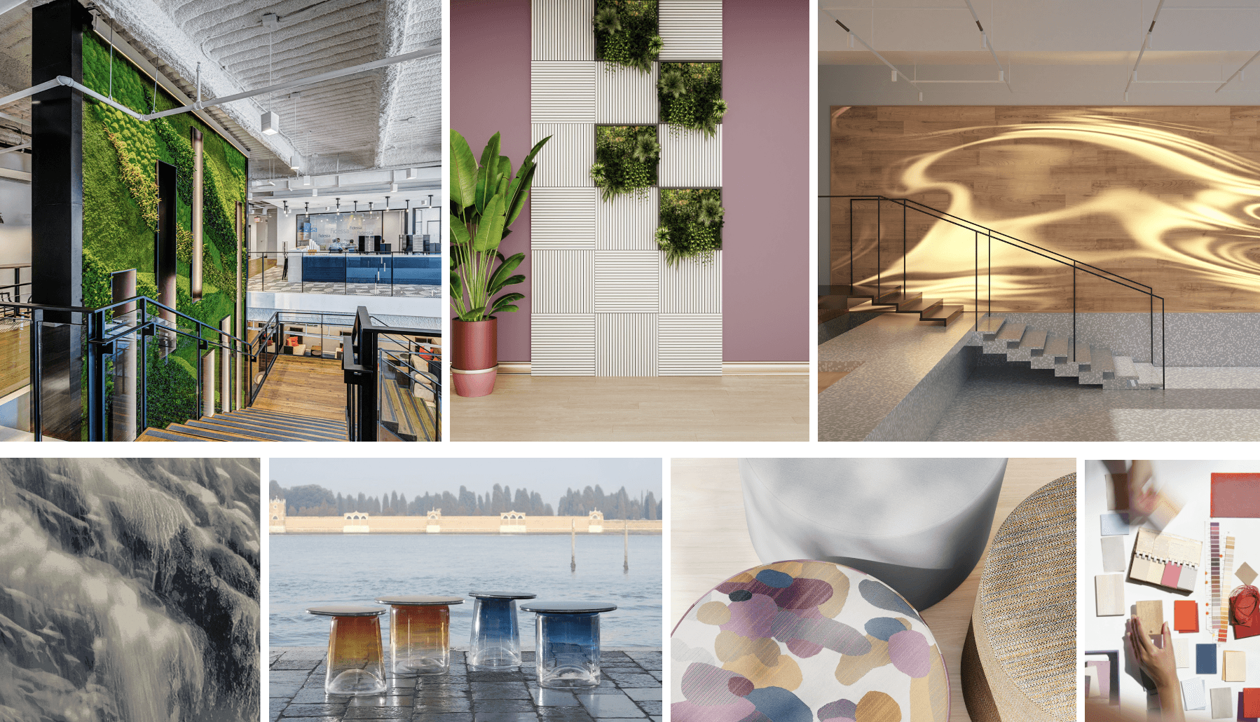 Immersive Biophilic Garden by Garden on the Wall®, Sculpt Walls by Egan Visual, ArtMorph by CECOCECO, Arctic Escape by Shaw Contract, Ice Collection by Bernhardt, Joy Collection by Designtex, and Carole Baijings for Stylex