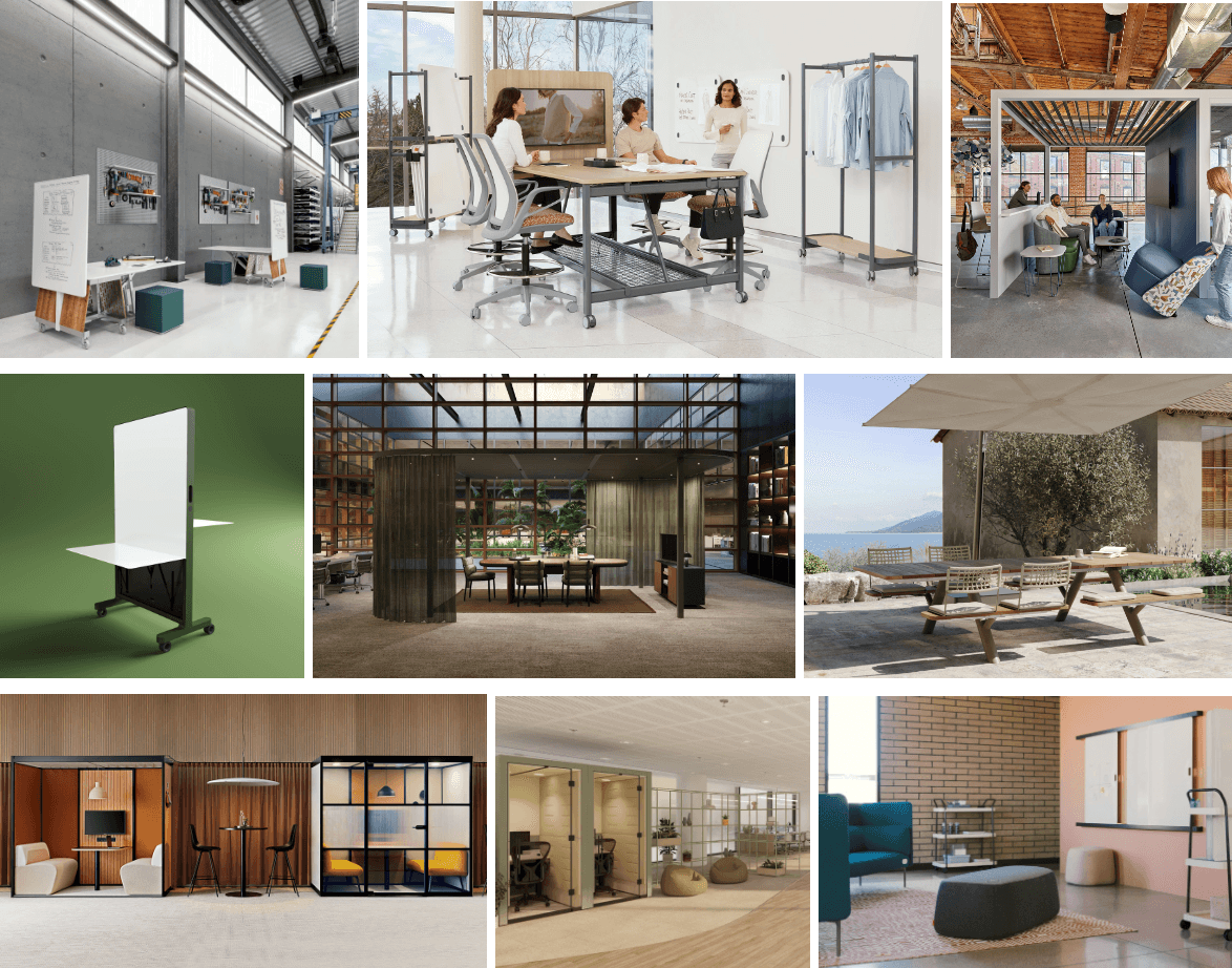 GRVT by Ghent, Group Collaborative Spaces by Global Furniture, Sonrisa Lounge Furniture by KI, Atmus Mobile Desk by Clarus, Pavilion O by Kettal, Panigiri by Extremis, Mews by Boss Design, Portals Huddle by Spacestor, and Collaborate by Haworth