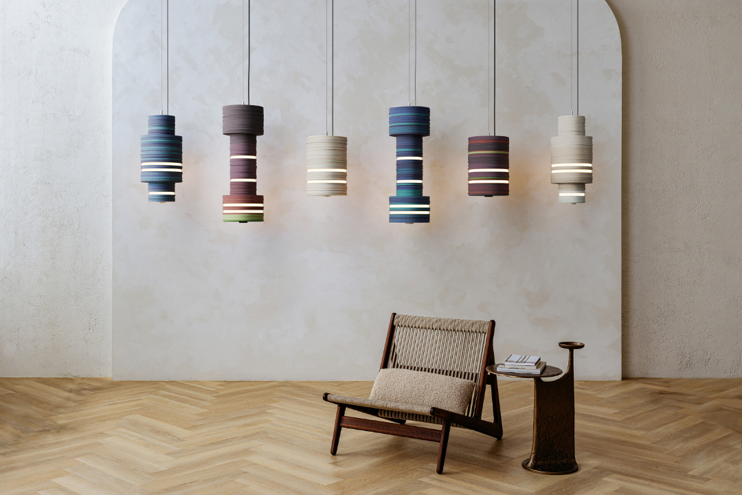 Stackabl turns regional textile and industrial offcuts into modular lighting and furniture using minimal processing and a system engineered for disassembly and material recovery. Wool, cork, PET, aluminum, and stone form a unified, durable, acoustically effective design language.
